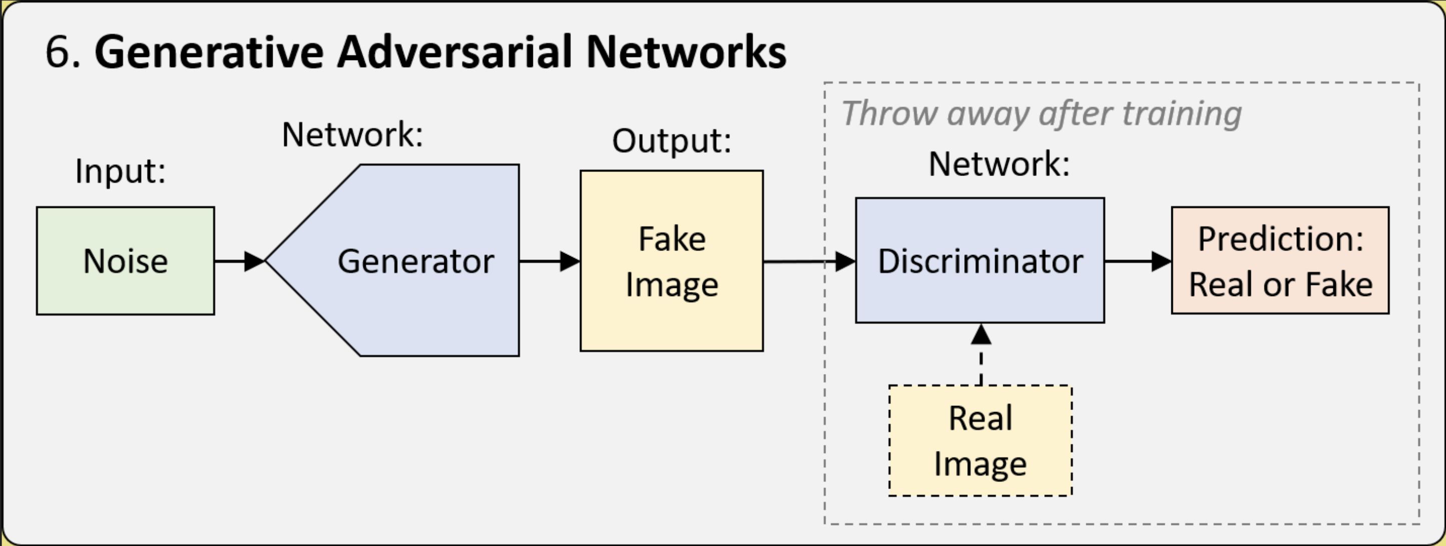 - Discriminator: a good old classification model that predicts if an image is real (from the training dataset) or fake (being generated).
